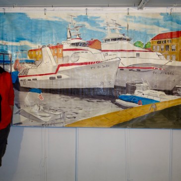 Bateau de pêche Port Vendres de nuit Peinture acrylique et fluorésceïne sur calendrier bancaire format 55cmx40cm