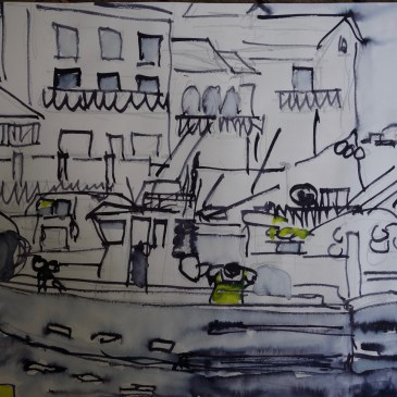 lavis encre noir Mont Blanc et aquarelle jaune (pour un) sur papier Daler Rowney format A3