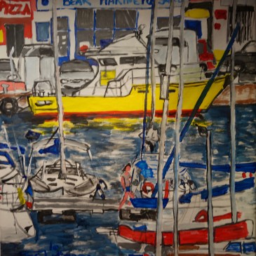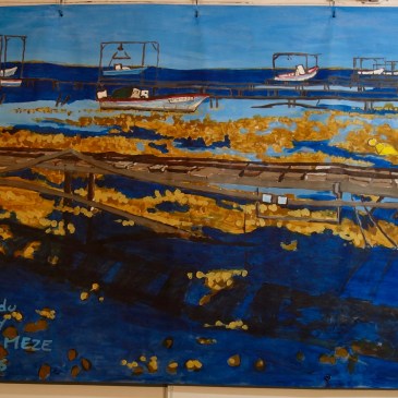 Vu de la terrasse du Mas de Cathy acrylique sur toile cirée, 3mx1,4m