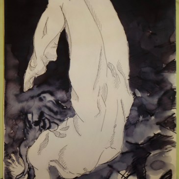 Plume et lavis d’encre noire Mont Blanc sur feuille Rowney format A3 collection particulière