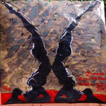X pour les 10 ans du salon des inventeurs et créateurs d’Auvergne Technique mixte: Encre de chine Mont Blanc, lait, peinture acrylique et Acronal sur papier craft format 1,20mx1,20m collection particulière