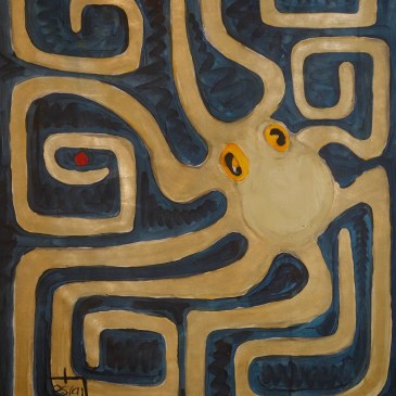 Aquarelle or vert, encres Campo Marzio (bleue turquoise et sépia) et encre noire Mont Blanc sur papier Daler Rowney format A3 Monkfish grinds black ideas while waiting for prey Watercolor green gold , Campo Marzio ink (blue turquoise and sepia) and Mont Blanc black ink on A3 format Daler Rowney paper