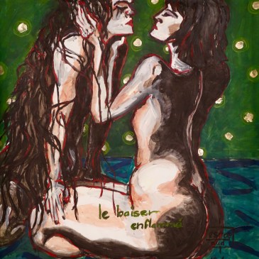 acrylique et fluorécéïne sur toile ciré format 1,30mx1,40m The kiss ignited Acrylic and Fluorecene on waxed canvas size 1.30mx1.40m
