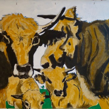 Acrylique sur toile cirée format 2,20mx1,40m Bien sûr ce ne sont pas les plus belles vaches du monde, aucune n’égale la beauté farouche de nos vaches rouges aux cornes en forme de lyre. Mais reconnaissez qu’elles sont bien mignones avec leurs yeux maquillés. Acrylic on waxed canvas format 2.20mx1.40m Of course they are not the … Lire la suite Aubracs