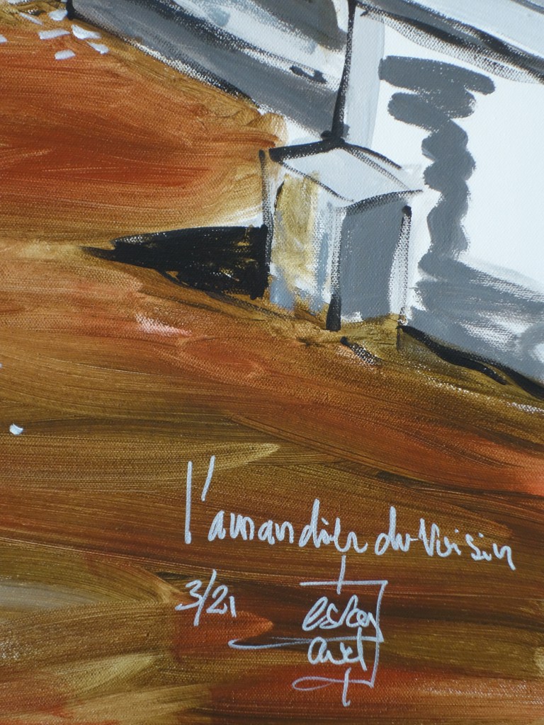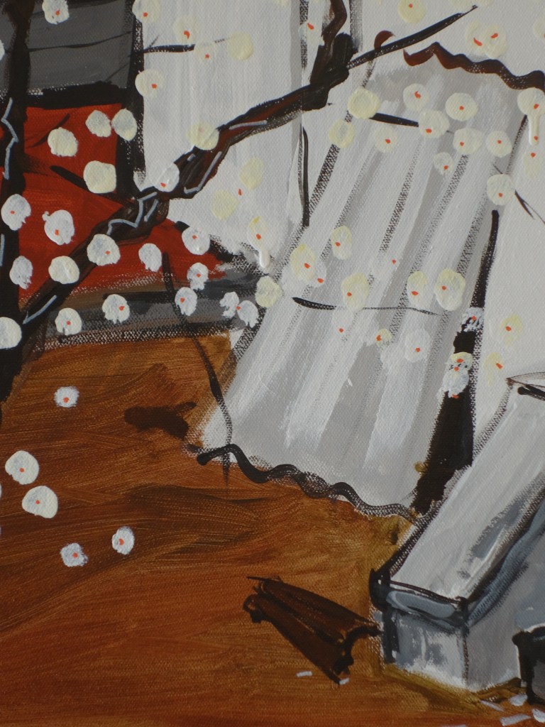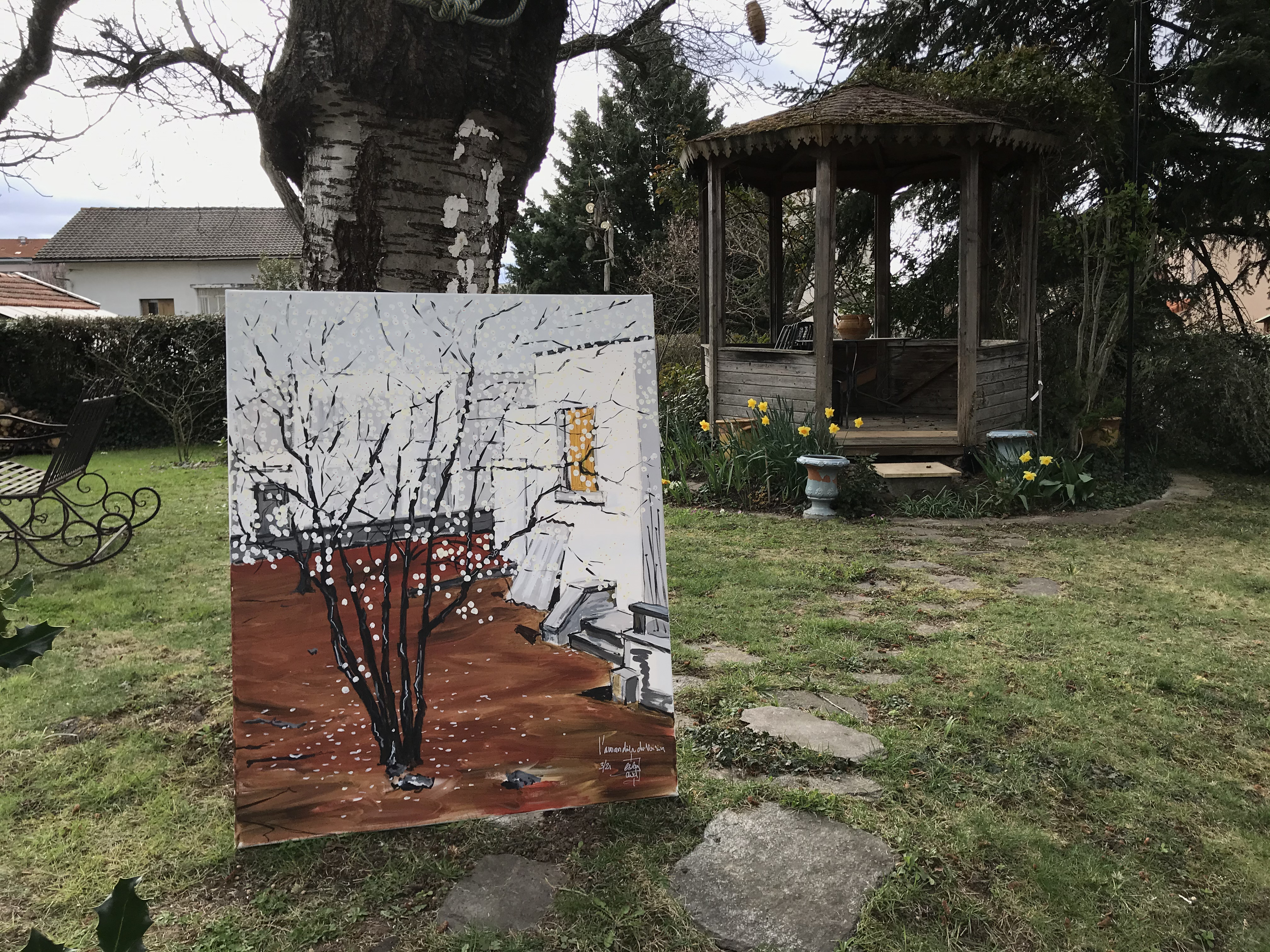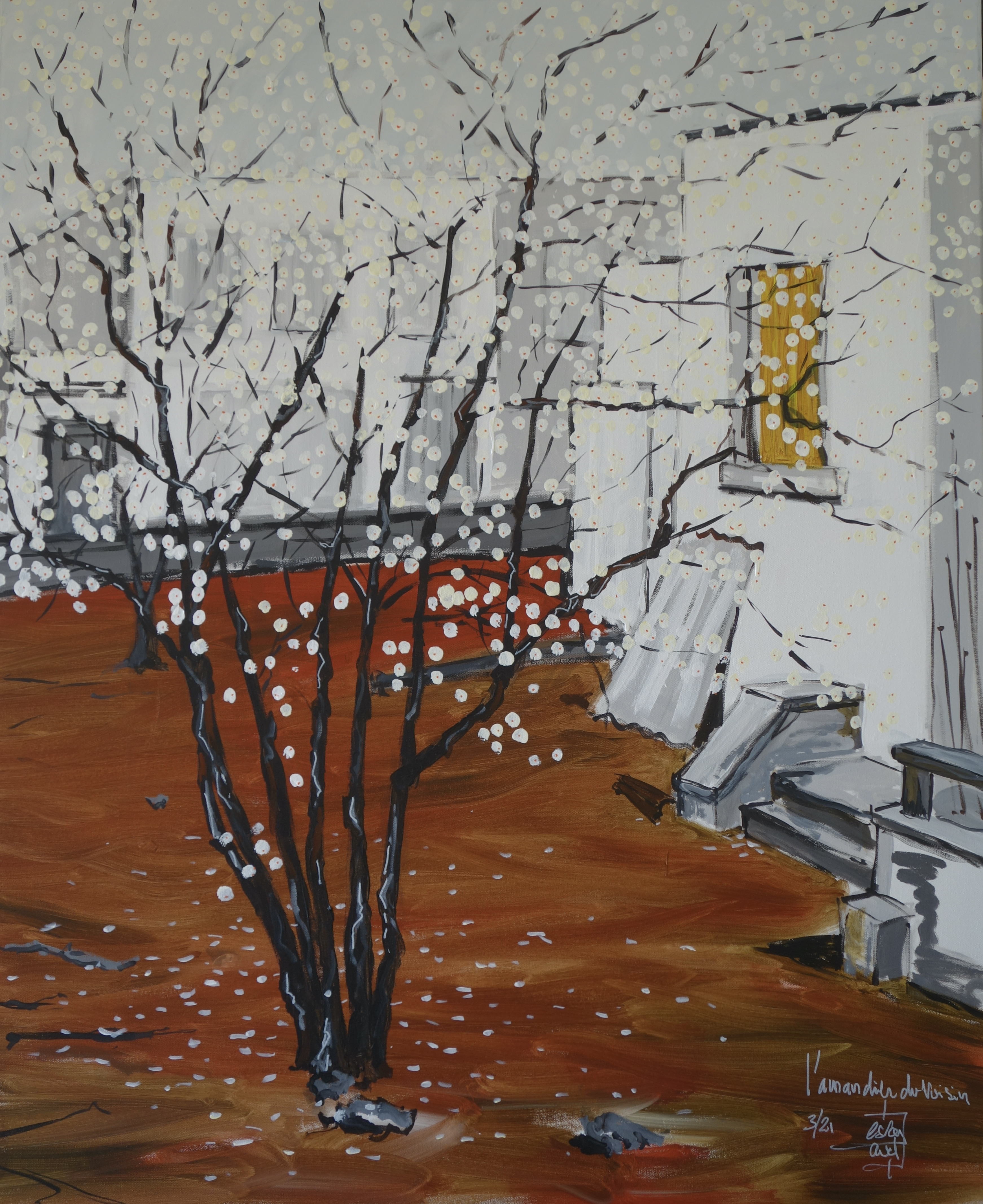The neighbor’s almond tree, it’s spring, despite the Covid life goes on, the almond tree is in bloom, it is magnificent. Acrylic on canvas Gerstaecker. My aspiration was to use very few different colors to highlight the range of white and gray, a painting while retained, once is not customary.