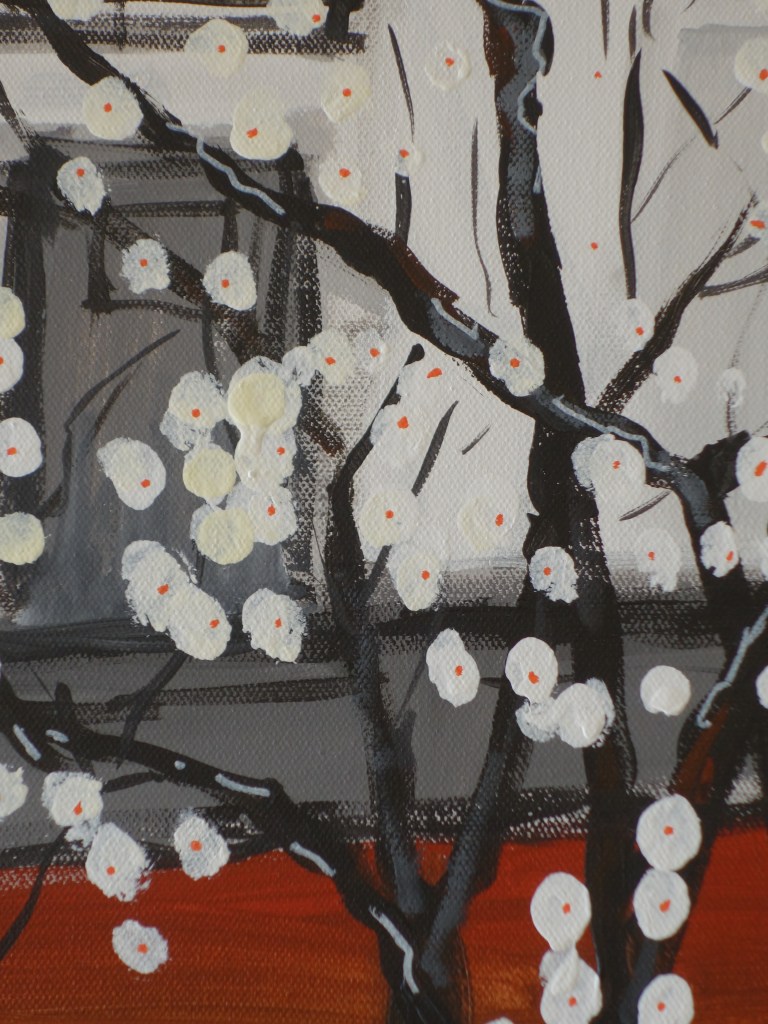 隣人のアーモンドの木、 春です。Covidの生活は続いていますが、アーモンドの木が咲いていて、壮大です。 キャンバスにアクリル絵の具Gerstaecker。 私の願望は、白と灰色の範囲を強調するために非常に少数の異なる色を使用することでした。