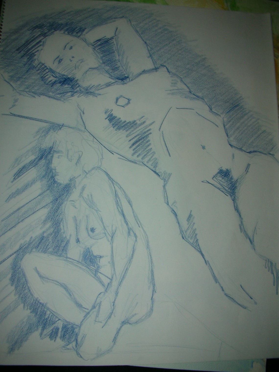 Nu assis crayon et lavis turquoise et noir sur papier Daler Rowney format A3 collection particulière