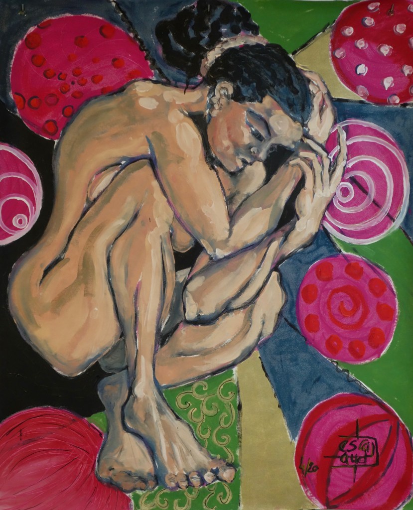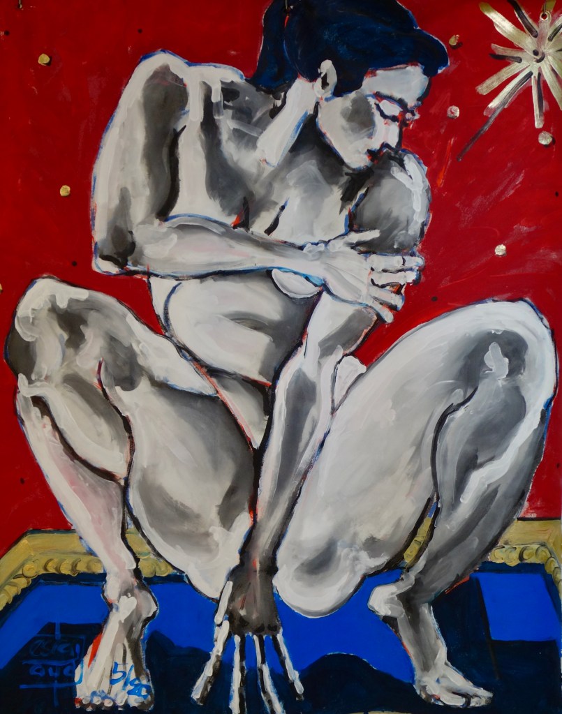 tu me vois à genoux, mais c’est moi qui contrôle acrylique sur toile cirée format 1,10mx1,40m