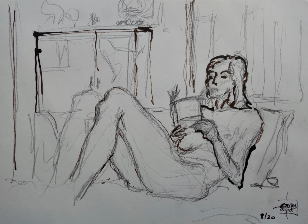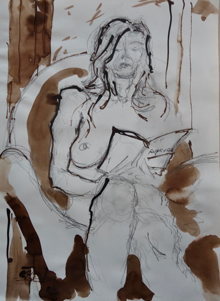 allongée sur le ponton, lying on the dock lavis d’encre noire et sépia sur papier Daler Rowney format A3 collection particulière