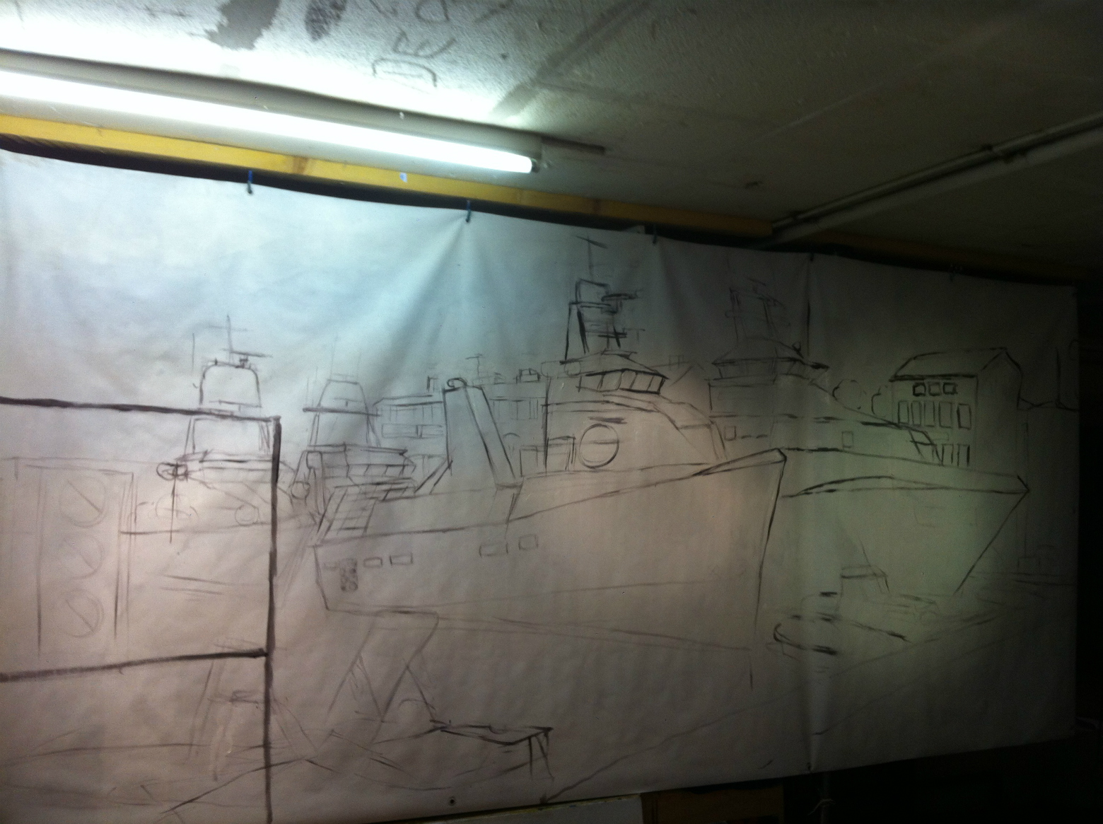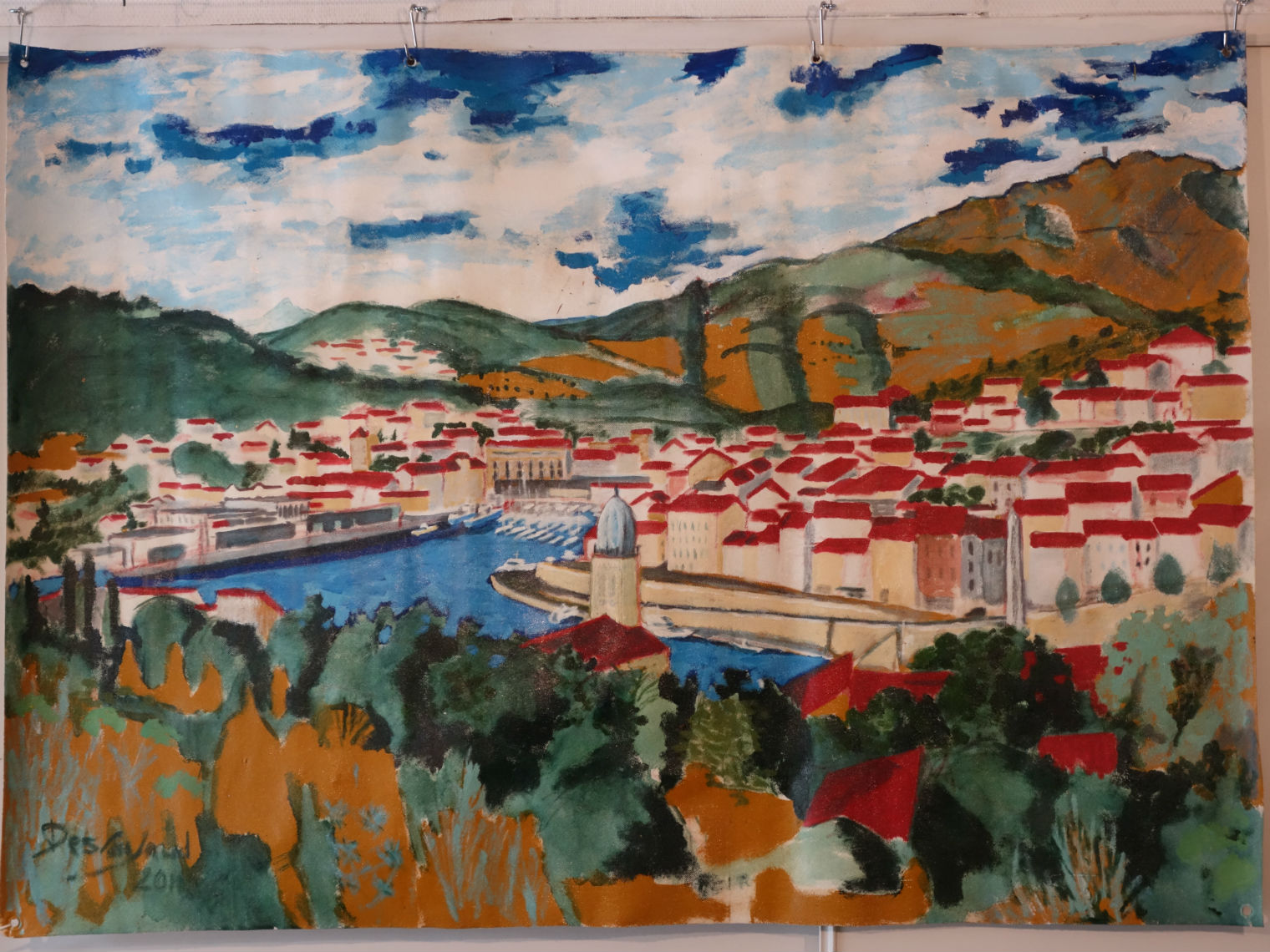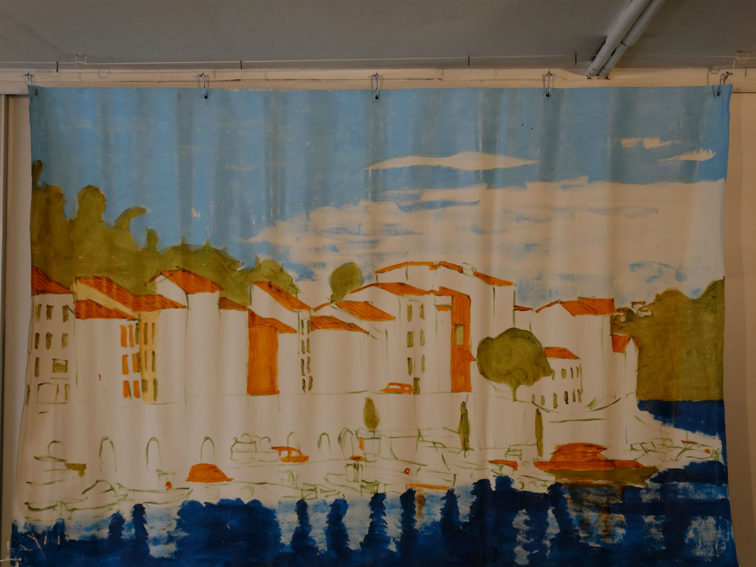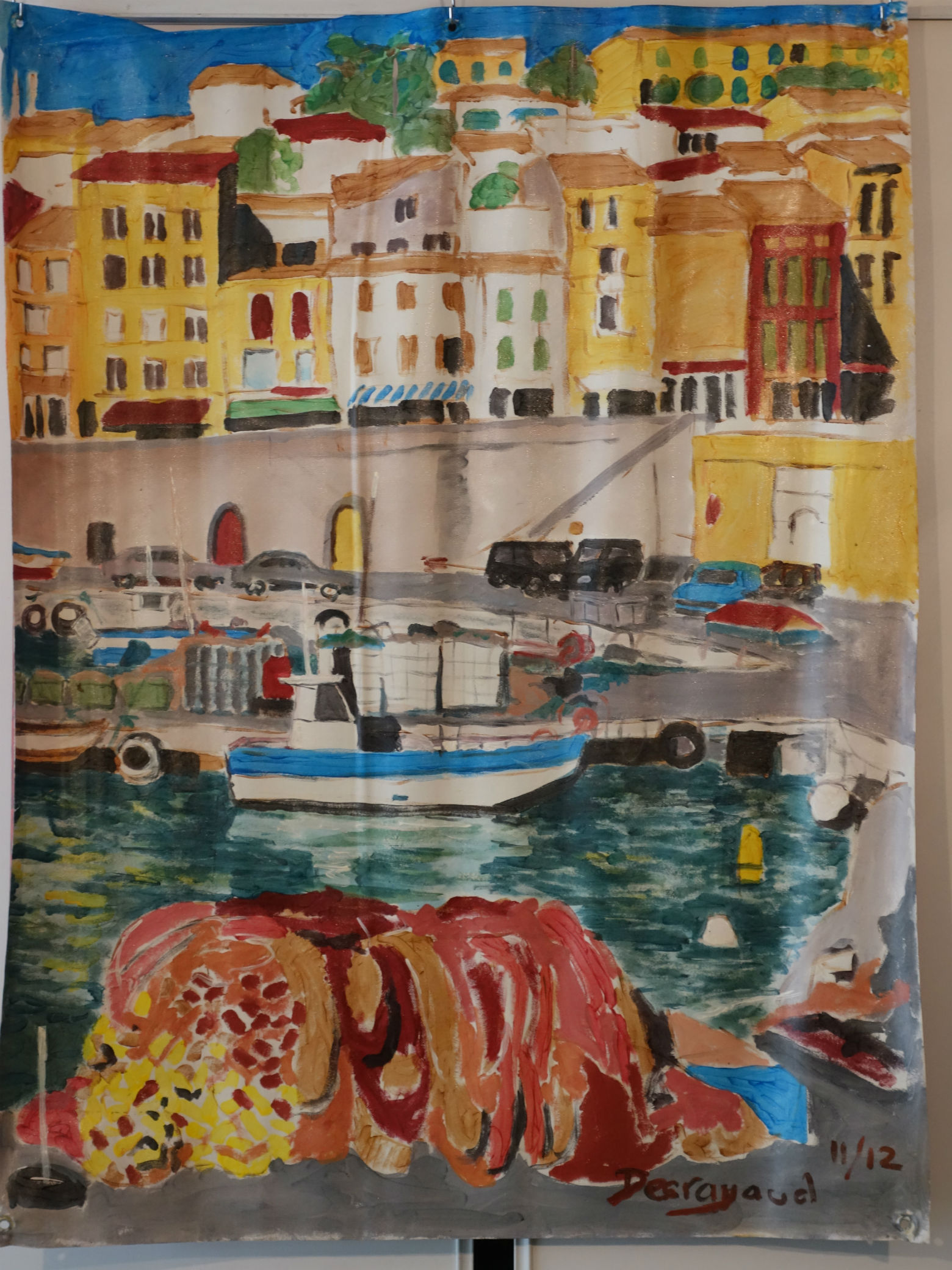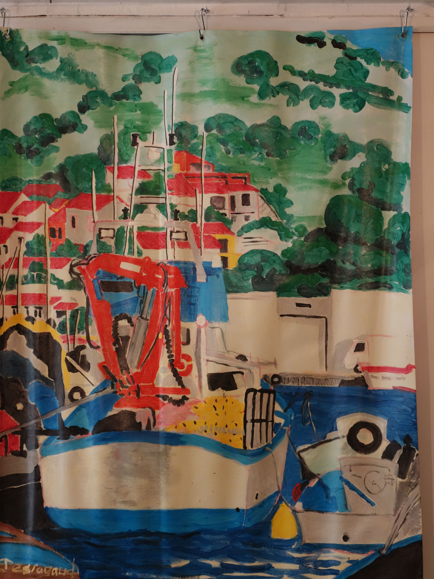 vue générale de Port Vendres acrylique, bleu de méthylène et fluoréseïne sur toile cirée format 2,50mx1,40m